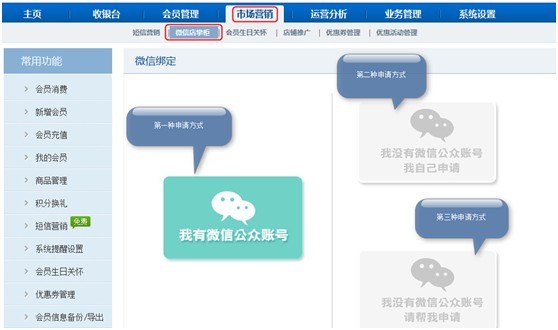 三種申請方式,第一種是已有微信公眾賬號商戶申請,第二種是自己去微信公眾平臺申請賬號后再來開通申請微信店掌柜功能,第三種是提交申請信息商卡通幫商戶申請開通。