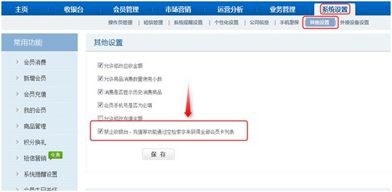 勾選 “禁止收銀臺、充值等功能通過空檢索字來獲得全部會員卡列表”之后(有效保護大批量會員隱私信息):