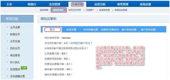 微信功能開通后,在微信概況里會顯示基本信息:公眾微信賬號關注數,通過微信領取會員卡數,公告查詢次數,通過微信領取優惠券,優惠活動查看次數,接收客戶咨詢信息數,接收反饋建議信息數。