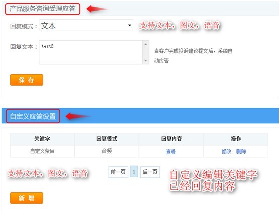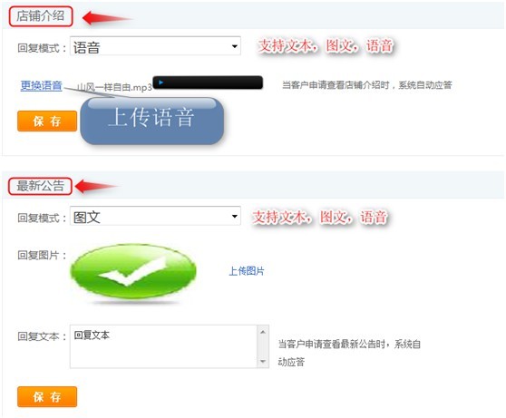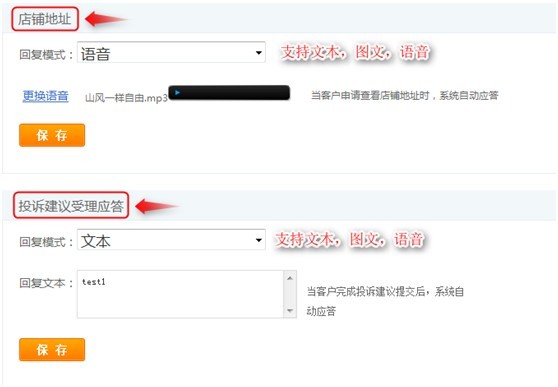 店鋪地址也支持文本,圖文,語音;投訴建議受理應答設置,當客戶提交投訴建議后,系統會自動應答客戶。