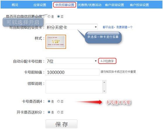 強大的會員招募設置功能。商戶一直關注商卡通的微信會員功能,散客可以通過關注微信點擊領取會員卡。商戶通過后臺設置具體發放微信會員卡的內容及規則。
