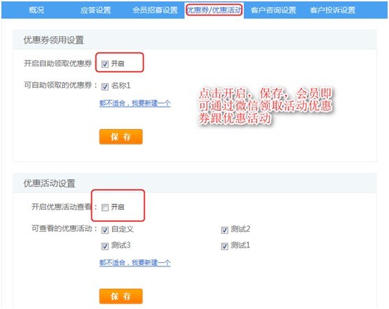 點擊開啟保存,即可將系統里的優惠券、優惠活動通過微信發布出去。客戶通過微信點擊領取優惠券、參加優惠活動,促進銷售量。