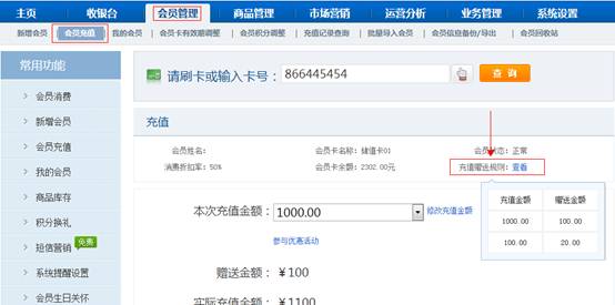 進入【業務管理】 - 【會員卡規則管理】設置儲值卡贈送規則,進入【市場營銷】 - 【優惠活動管理】功能設置充值滿贈送金額。在【會員管理】 - 【會員充值】功能充值時可同時參加優惠活動跟儲值卡贈送規則。