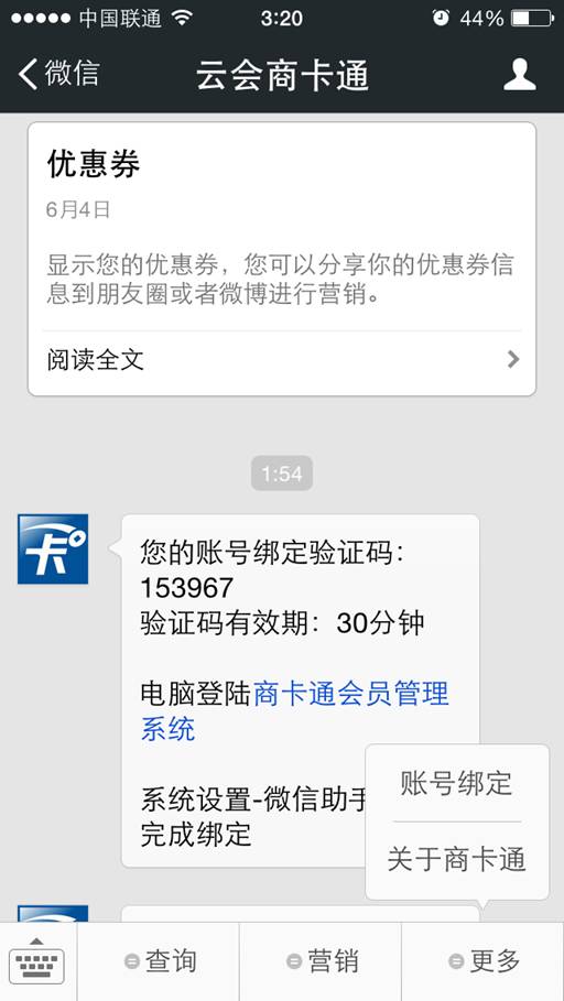 3) 在商卡通服務號的菜單中選擇“更多”—“賬號綁定”,您會獲得一個綁定驗證碼