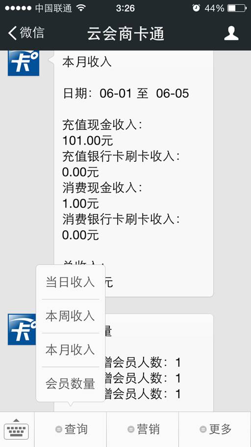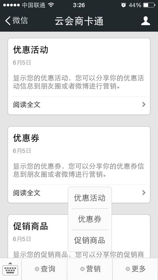 通過微信關注商卡通的微信服務號,便可在微信中查詢交易、會員等信息,并且可以通過朋友圈分享優惠信息和商品。
