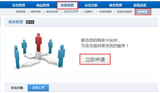 1 ) 在“市場營銷”的“商家聯盟”功能下進行申請;