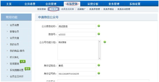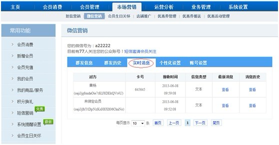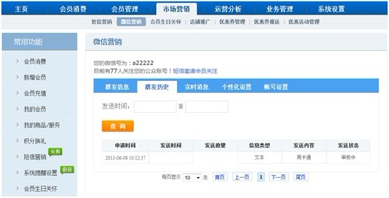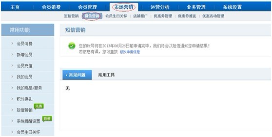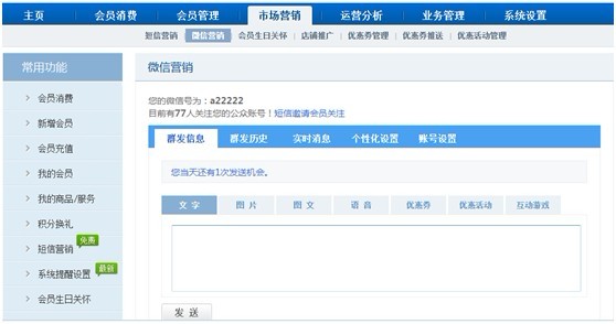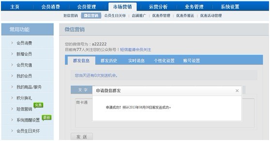 4. 審核成功后,微信功能頁面會顯示出來。可以點擊“短信邀請會員關注”,編輯短信通知會員。