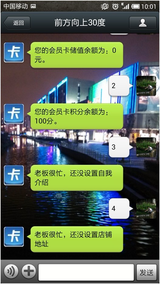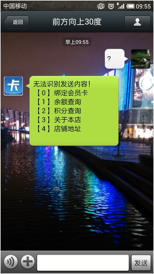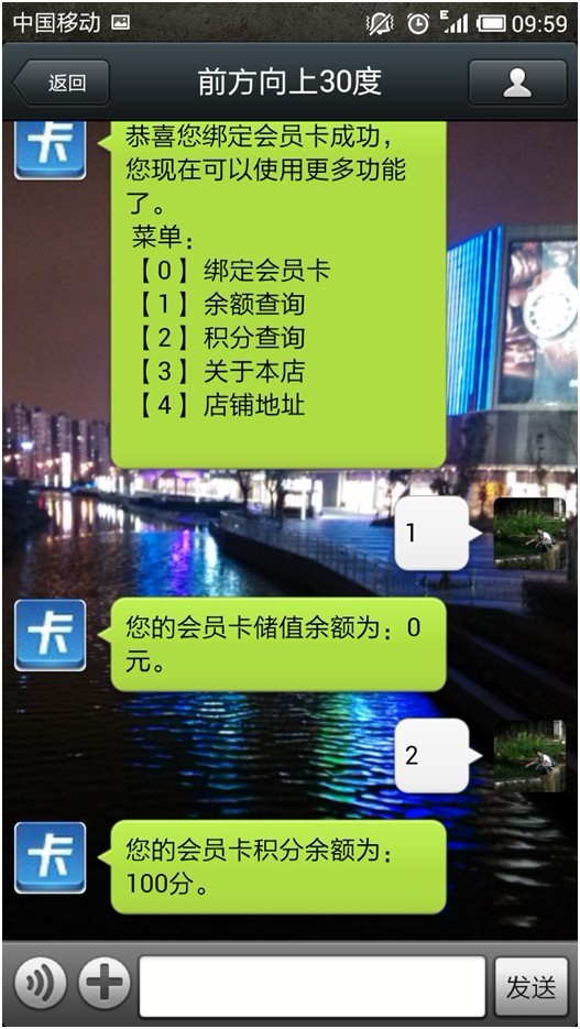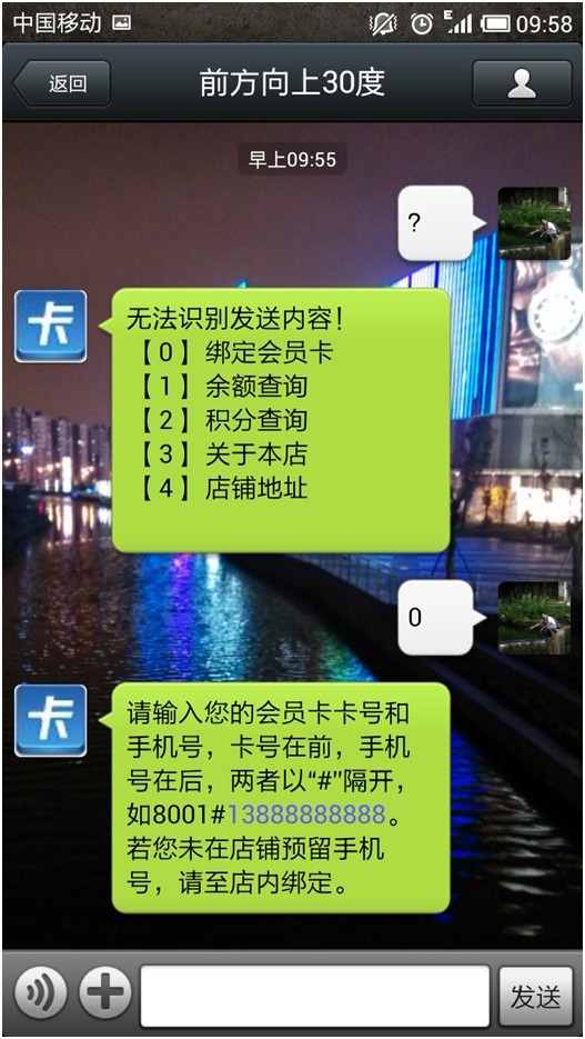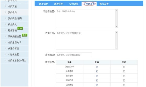 b. 關注后,進行綁定會員卡。“店鋪介紹”,“店鋪地址”在【個性化設置】里面都可以設置。勾選開始月查詢、積分查詢,會員就可以按照提示流程進行查詢余額、積分了。