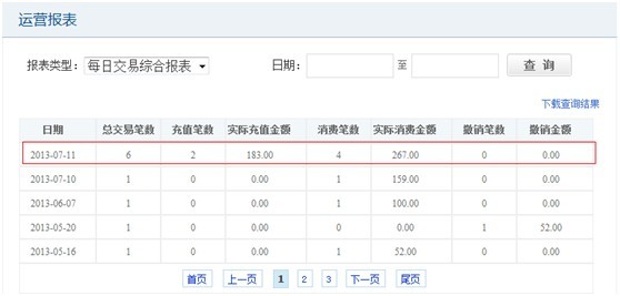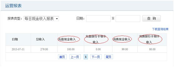 b. “每日現金收入報表”,分為充值現金收入、充值銀行卡刷卡收入、消費現金收入和消費銀行卡刷卡收入。方便商戶對賬。