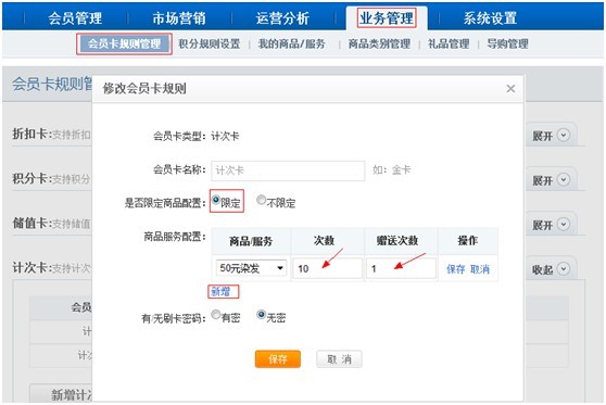 計次卡充值贈送次數設置,第一步:進入【業務管理】-【會員卡規則管理】功能,在計次卡設置時選擇“限定“,在商品服務配置里點擊“新增”,輸入充值次數跟贈送次數后,保存完成設置。