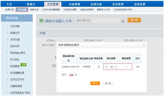 第二步:在【會員管理】-【會員充值】及【會員管理】-【新增會員】-新增計次卡充值時,輸入要購買的數量,達到設定的次數,即可顯示贈送次數,如圖: