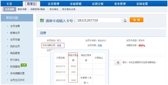 【收銀臺】-【會員消費】刷卡或者輸入會員消費時查看歷史消費記錄添加了商品交易金額: