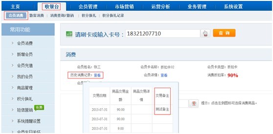 【收銀臺】-【會員消費】刷卡或者輸入會員消費時查看歷史消費記錄有交易備注顯示。