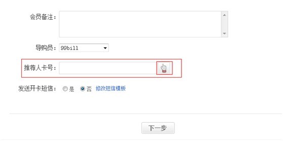 b. 【會員管理】-【新增會員】時輸入推薦人卡號或者點擊小圖標進入檢索選擇對應推薦人。