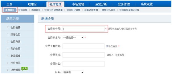 打開【新增會員】功能鼠標光標自動切換到卡號位置,節(jié)約商戶時間。