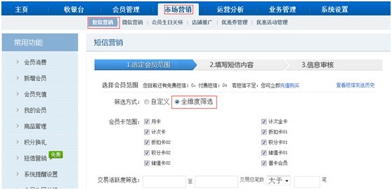 a. 進入【市場營銷】-【短信營銷】功能,勾選全維度篩選。