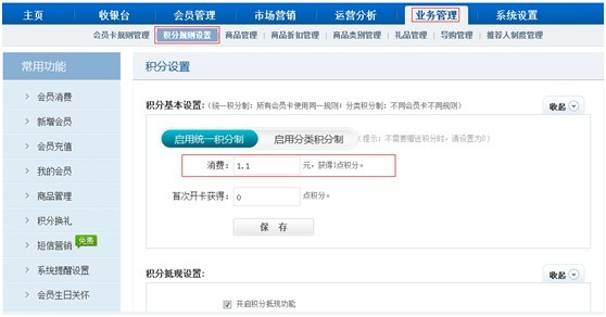進入【業(yè)務管理】-【積分規(guī)則設置】功能輸入消費金額支持小數(shù)點。