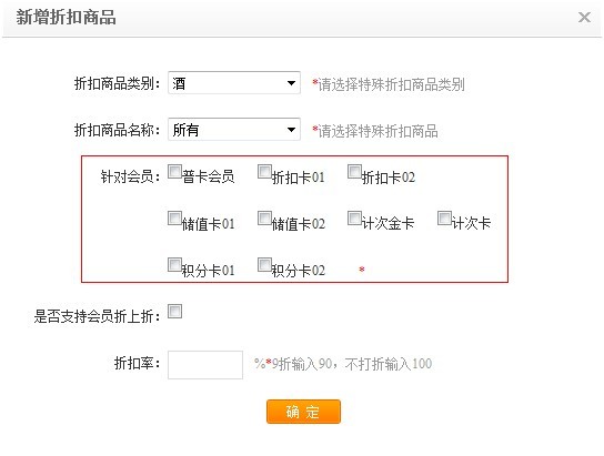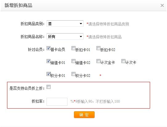 d. 若本來的卡類型有折扣,需折上折的可以勾選“是否支持會員折上折”,最后輸入折扣率,9折輸入90,不折扣輸入100,確認完成設置即可。