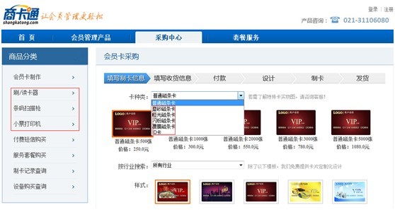 采購中心會員卡制作添加了磨砂磁條卡、啞光磁條卡、閃粉磁條卡、覆膜磁條卡、ID卡。原版的相關設備拆分為:條碼掃描槍、小票打印機、刷/讀卡器。