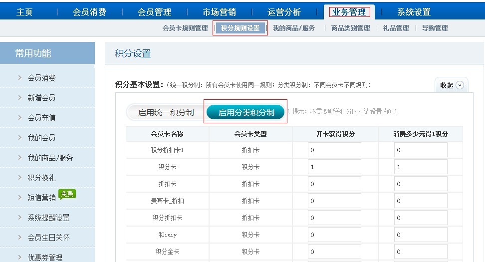 第一步,登陸軟件打開【業務管理】-【積分規則設置】,點擊“啟用分類積分制”。