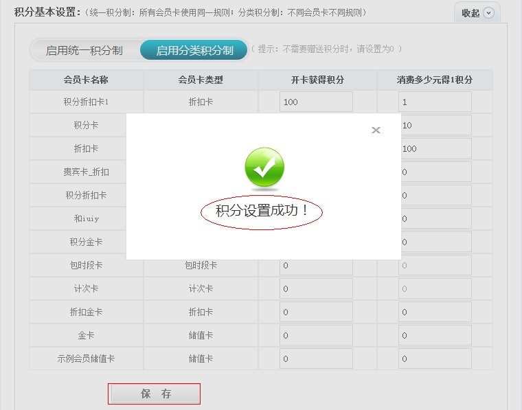 最后一步,點擊“保存“設置。彈出“積分設置成功“即可完成積分規則設置。