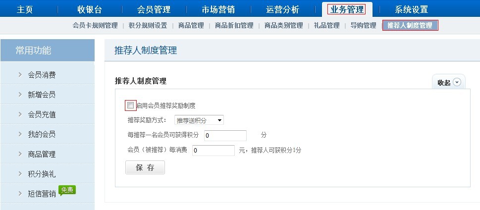2. 進入【業務管理】-【推薦人制度管理】功能,勾選開啟會員推薦獎勵制度。