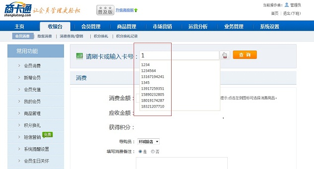【收銀臺】 - 【會員消費(fèi)】,輸入卡號的時候,輸入其中 1 個或者幾個數(shù)字,系統(tǒng)自動顯示出跟數(shù)字有關(guān)的相關(guān)會員。