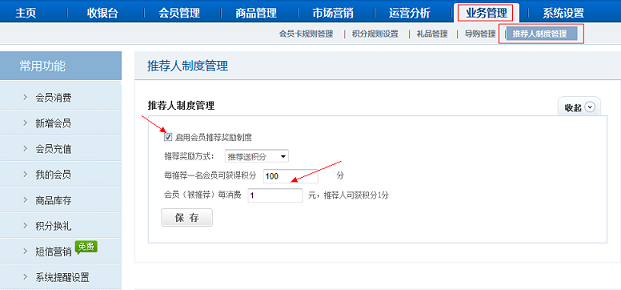 進入【業務管理】 - 【推薦人制度管理】功能,輸入推薦人贈送積分規則,每推薦一名會員獲得積分數,以及被推薦人消費,推薦獲得積分數設置。點擊“開啟會員推薦獎勵制度”。