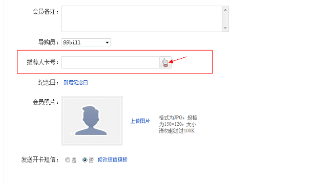 進入【會員管理】 - 【新增會員】功能,新增時在推薦人卡號選項,手動輸入推薦人卡號即可。