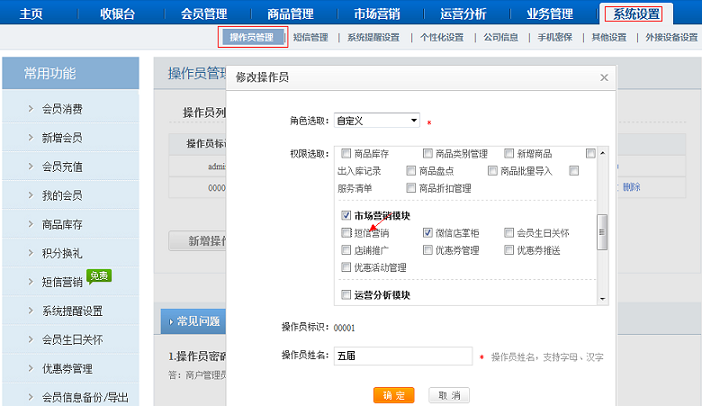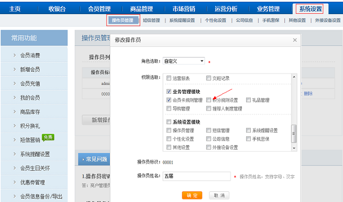 這時(shí),通過管理員( admin )身份登陸軟件,給該操作員勾選【新增商品】、【積分規(guī)則設(shè)置】、【短信營銷】三大權(quán)限保存即可解決。權(quán)限的限制,為了避免操作員店員誤操作,給老板更多的權(quán)限設(shè)置。