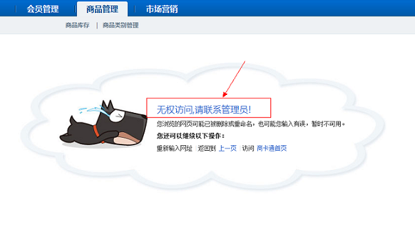 操作員【新增商品】、【積分規(guī)則設(shè)置】、【短信營銷】三個(gè)功能未開啟時(shí),操作員點(diǎn)擊“新增商品”、“修改積分規(guī)則”、“發(fā)送短信”將出現(xiàn)“無權(quán)訪問,請聯(lián)系管理員“提示。