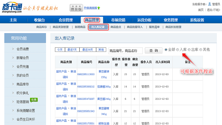 登陸商卡通軟件,進入【商品管理】 - 【出入庫記錄】功能,輸入商品編號或者商品名稱進行查詢詳細的商品出入庫記錄。方便商戶輕松了解自己的商品庫存情況。