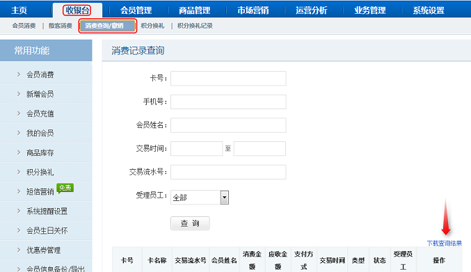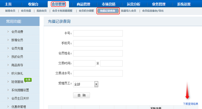 進入【會員管理】 - 【充值記錄查詢】功能,同理點擊“下載查詢結果“即可。