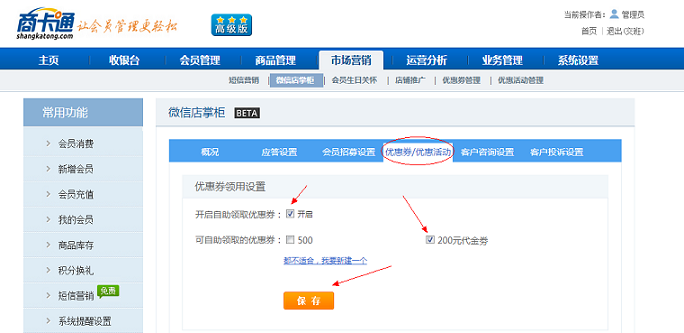 進入【市場營銷】 - 【微信店掌柜】功能。開啟優惠券、選擇優惠券,最后保存。