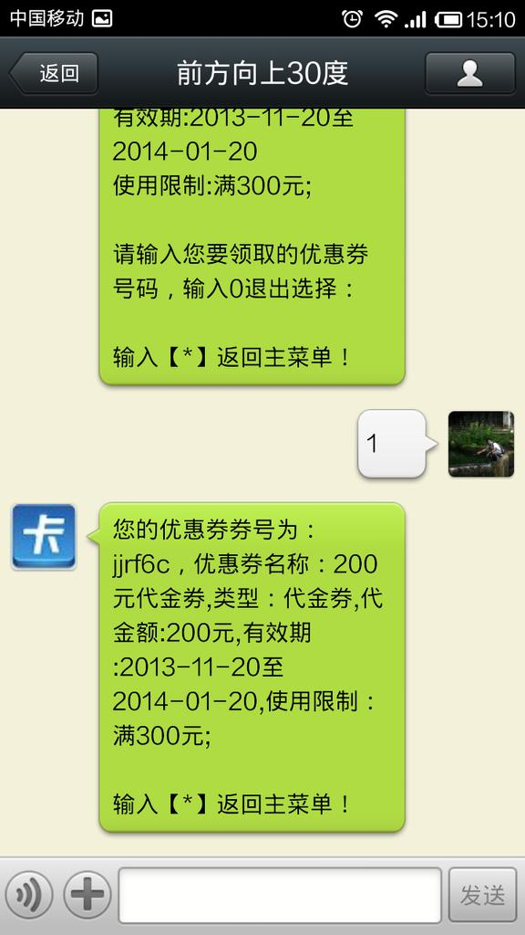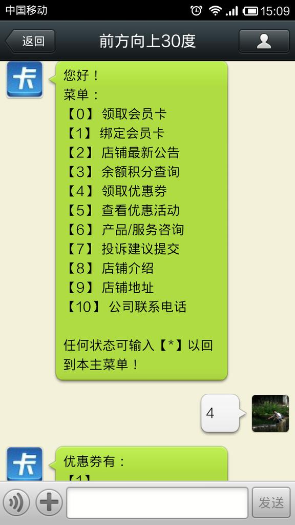 微信生效后,在微信對話中,可領取優惠券號。會員憑卷號到店鋪消費。