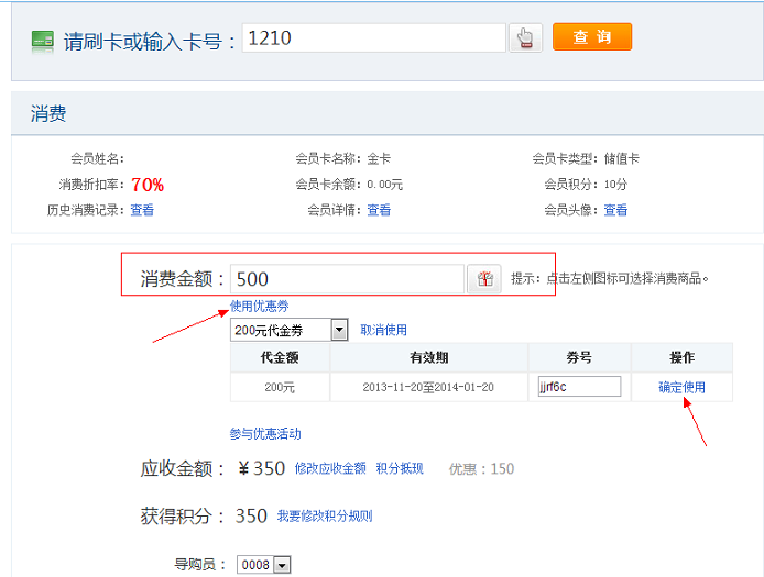 會員進店消費,進入【收銀臺】 - 【會員消費】,在達到優惠券規則的情況下,點擊使用優惠券,輸入卷號,完成消費即可。