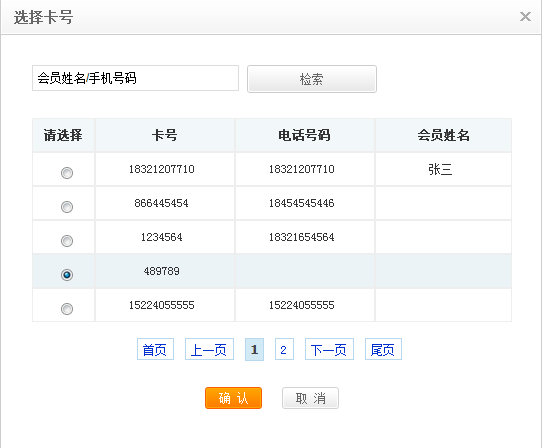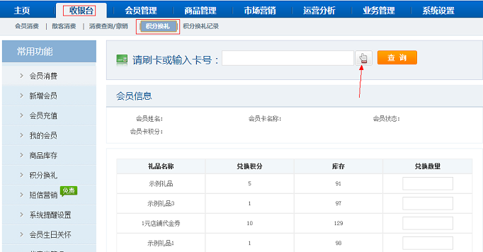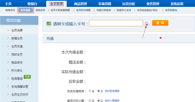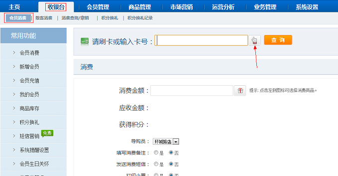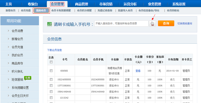 進入【會員消費】、【我的會員】、【積分換禮】、【會員充值】、【會員積分調(diào)整】功能時,點開手指圖標,進入檢索模式。輸入會員姓名或手機號即可查詢到會員信息。