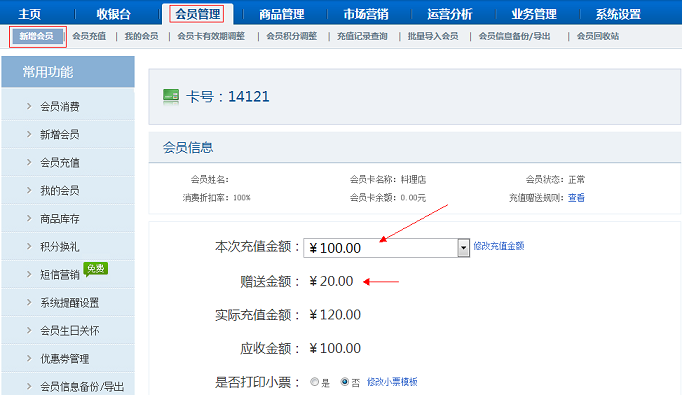 規則設置好后,在【會員管理】 - 【新增會員】 - 【會員充值】功能,對應的儲值卡會員可享受充值贈送金額優惠。