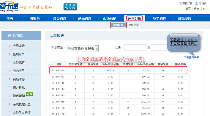 三和酒業河南分公司在 2013 年跟商卡通達成合作,正式使用商卡通會員管理軟件。公司負責人許小姐就商卡通操作功能方面,曾多次溝通了解。特別是對財務統計功能實現相關問題做了詳細的咨詢。許小姐:“你好,軟件財務報表在哪里可以看到?可以下載么?”,商卡通:“您好,可以在運營分析功能查看每日交易綜合報表,可以點擊下載查詢結果下載報表。“通過在線對話咨詢方式,許女士詳細了解到了商卡通統計報表功能,并且可以不分地點,單獨新增操作員賬號,可以在公司或者在家里都可下載運營分析報表。