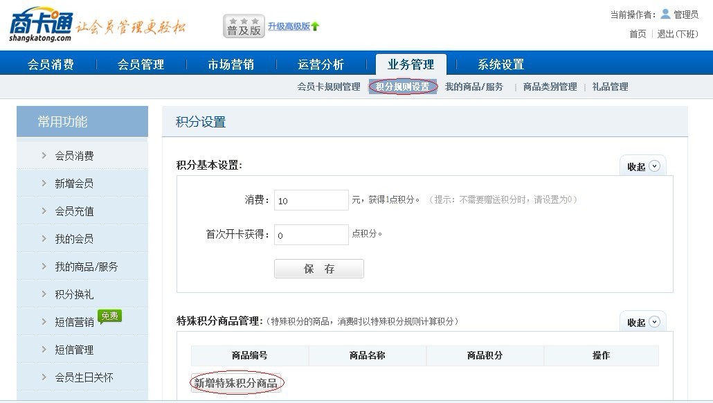 第一步,點擊進“業務管理”-積分規則設置“功能,點擊”新增特殊積分商品“: