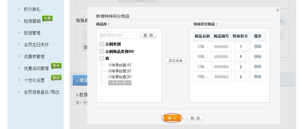 第二步(比如有四種類型商品“15年茅臺酒1斤”、“30年茅臺酒1斤”,“15年茅臺酒2斤”、30年茅臺酒2斤“。)選擇需要設置特殊積分的商品,輸入積分: