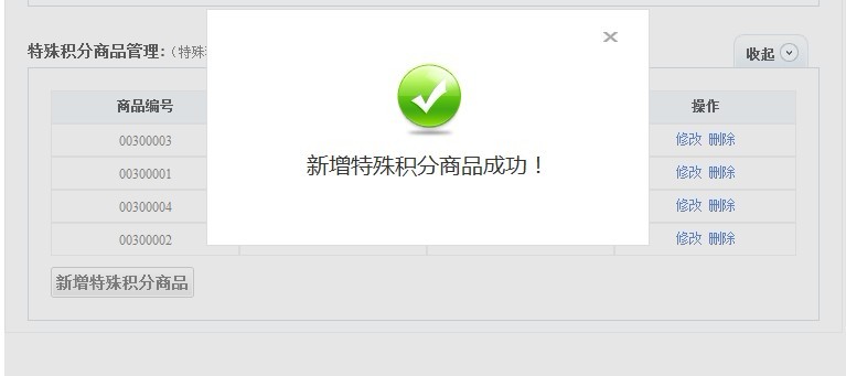 第三步,按照第二步設置好規則后,點擊“確認”會顯示“新增特殊積分商品成功”即完成設置:
