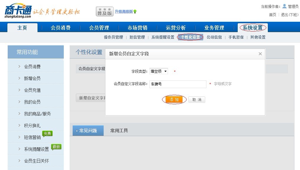 1. 我先演示下。會員管理系統設置-個性化設置功能。點擊“系只能自定義字段”,我填寫的是“車牌號”,類型選擇填空項(一些供選擇的條件需要用選擇項),點擊“添加”。