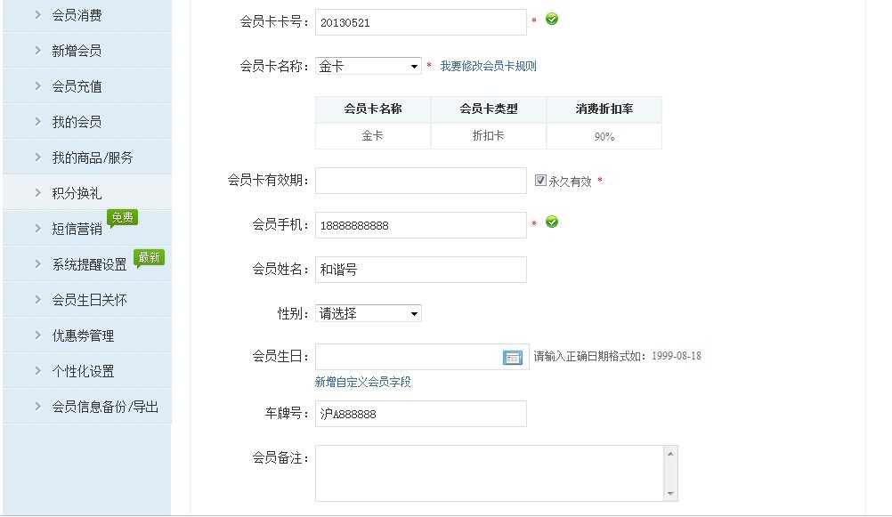 2. 添加自定義段后,在新增會員的時候會顯示出來。“會員管理”-“新增會員”功能,新增一個名為“和諧號”的會員, 在車牌號位置填寫名為“和諧號”會員的車牌號。