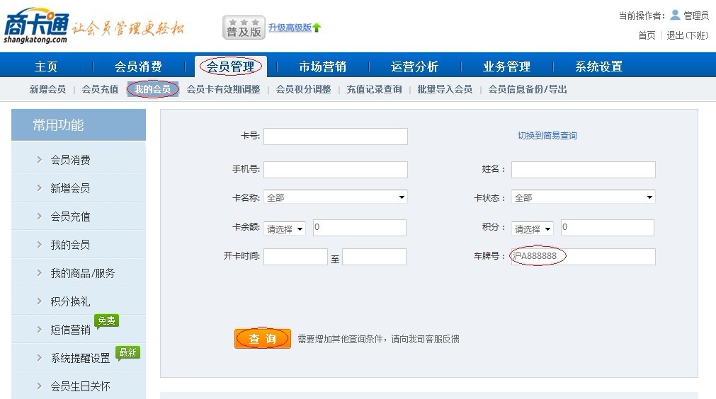 3. “和諧號“已經成為我的會員,他下次來消費的時候。我在”會員管理“-”我的會員“功能切換到高級查詢,在車牌號位置填寫上車牌號。點擊:查詢。