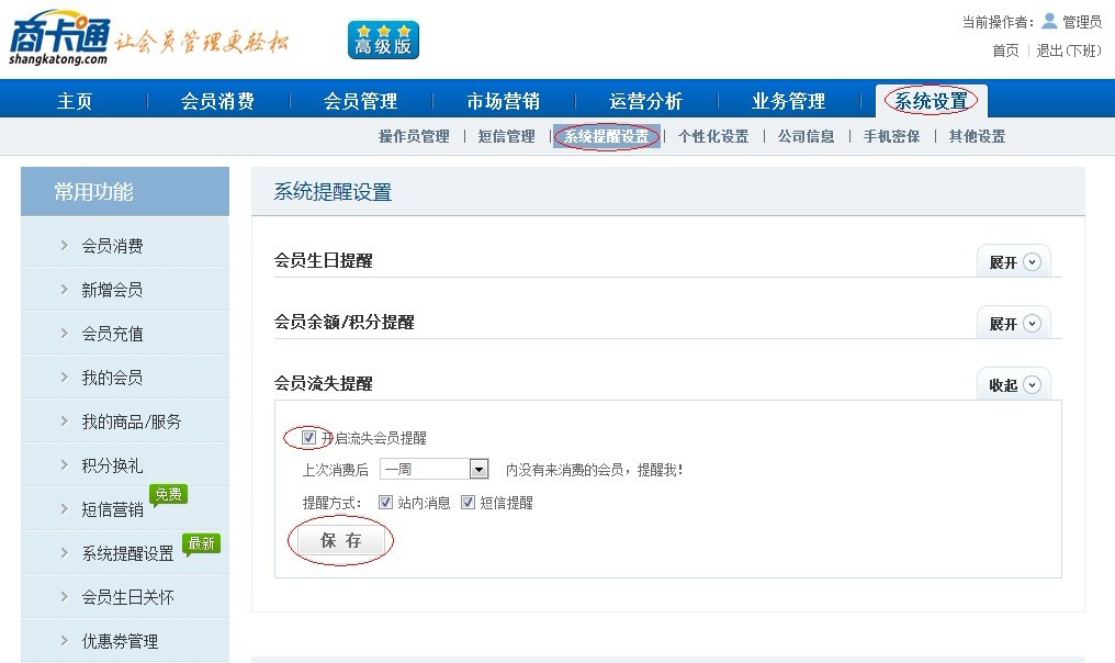 1. 系統設置-系統提醒設置功能。勾選“開啟流失會員提醒“,日期可以選擇一周、一月、二月、三月、半年甚至一年。。