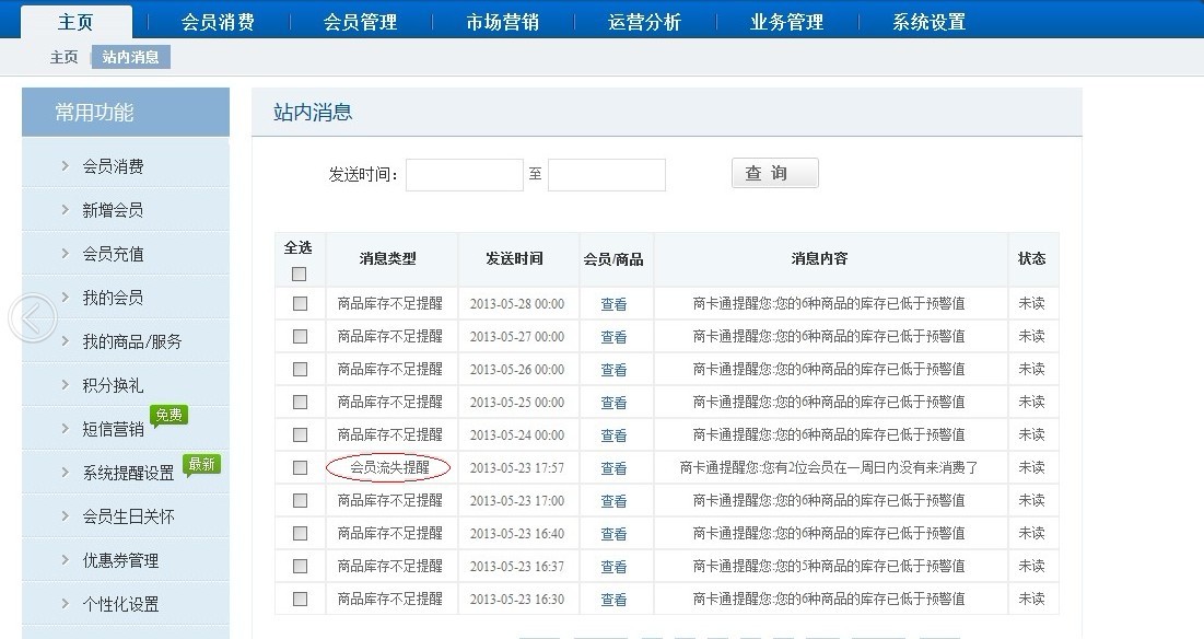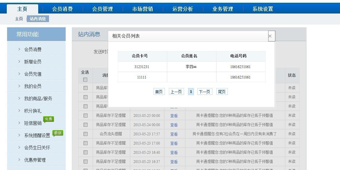 收到站內消息,點擊查看查詢具體會員。需要發送短信可以直接勾選會員,點擊“發送短信”進行編輯短信內容,最后確認發送即可完成。