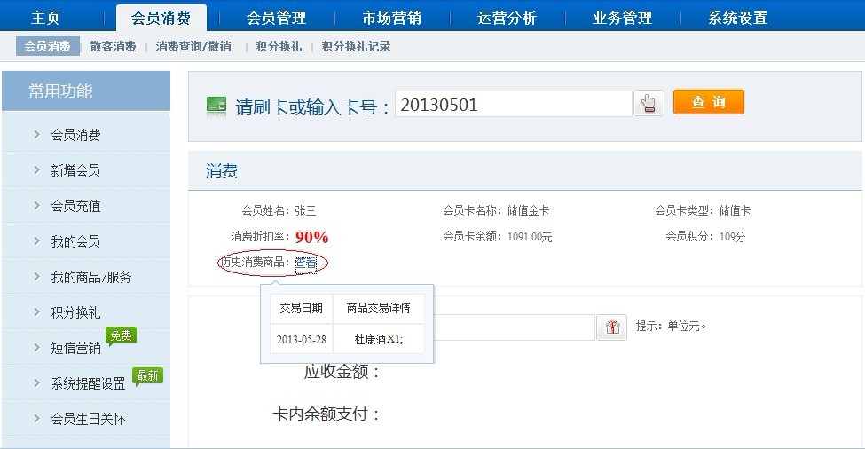 “會員消費”-“會員消費”功能。刷卡或者輸入卡號后,系統自動顯示該會員信息,在“歷史消費商品”處,鼠標左鍵移動到“查看”即可查看之前交易記錄。