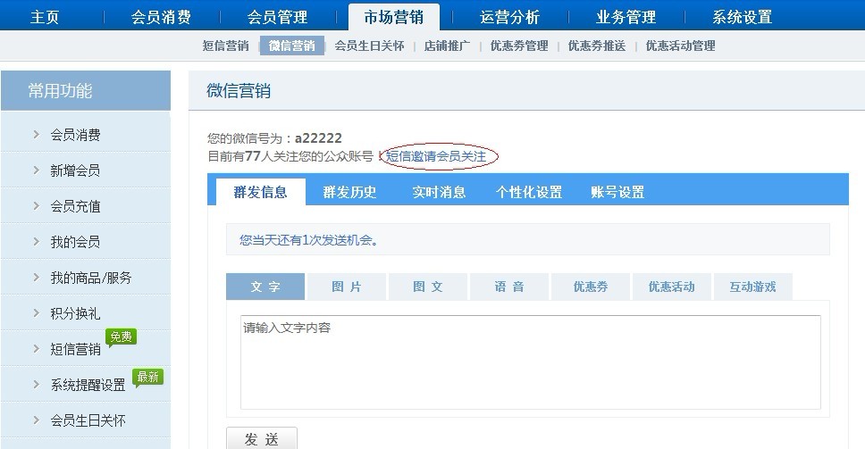 進入【市場營銷】-【微信營銷】功能直接點擊“短信邀請會員關注”,編輯短信群發通知。
