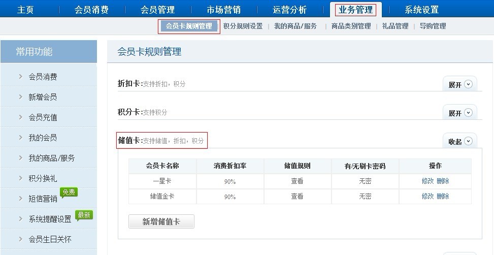 一種卡,想要儲值、積分、折扣都要有,通過在商卡通會員管理軟件,【業務管理】-【會員卡規則管理】功能里面新增儲值卡一種卡即可,同時支持儲值、積分、折扣。
